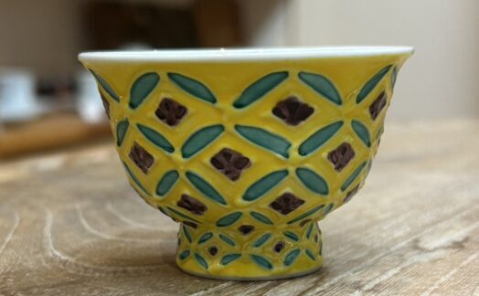 - 模様がなく、単色の器です。ヴィヴィッドにあるような交趾の鮮やかな色で、全体を覆ったもの、もしくは内側は素の色で、外側を彩ったものが主になります。交趾では使わない釉薬を使った色のものもあります。